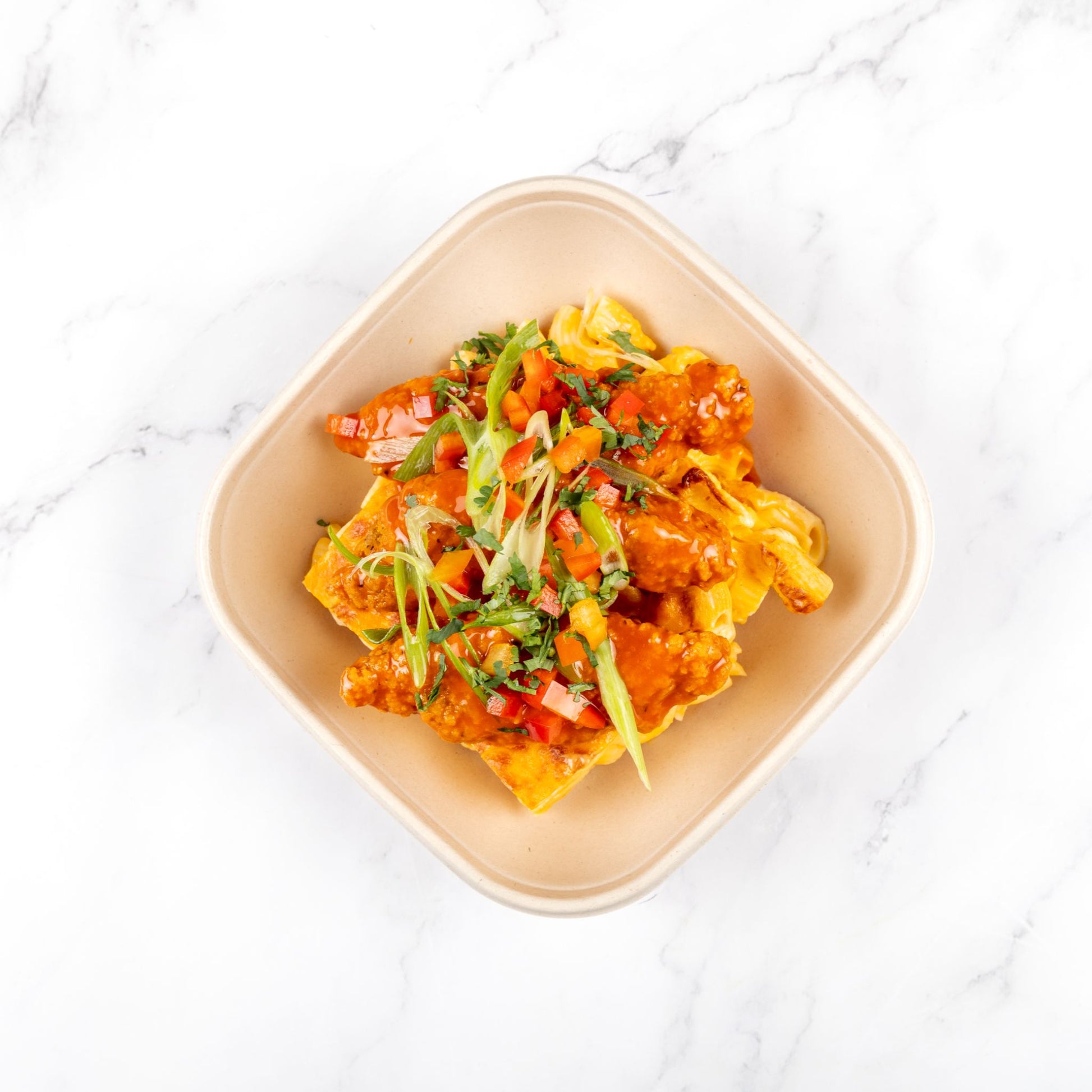 Buffalo Chicken Tenders in Frank’s Hot Sauce atop a creamy, cheddar laden mac and cheese. Juicy chicken tenders deliver a bold, punchy heat, while the mac delivers silky, melt in your mouth cheesiness. This indulgent combo stays on the good side of nutrition with lean protein from chicken and a comforting portion-controlled mac base, making it a satisfying option for game days or a hearty weeknight treat.