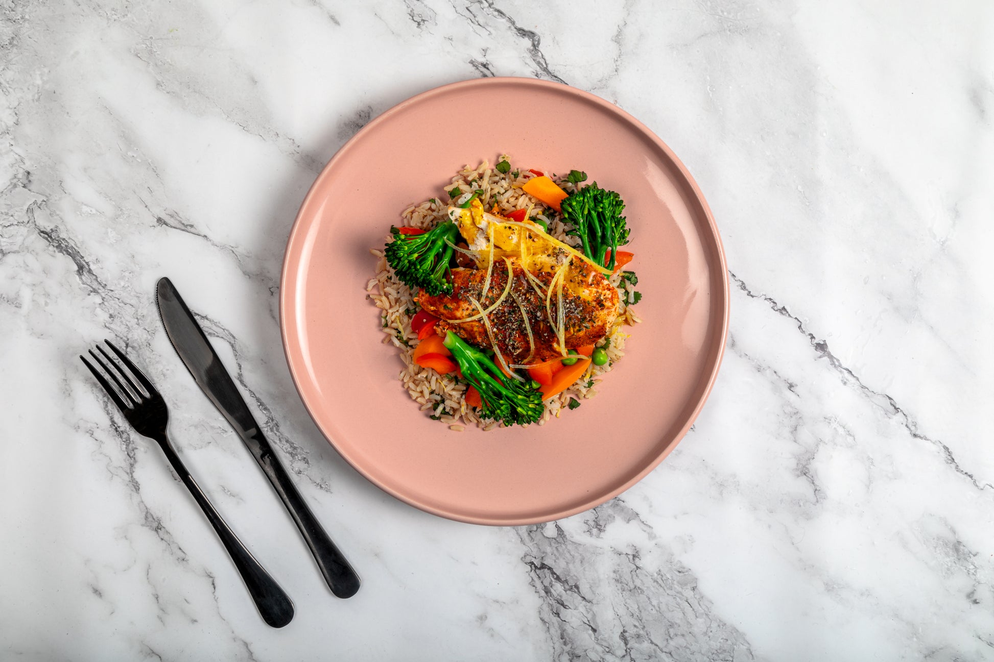 Tender chicken breast, in a lemon sauce, roast peppers, seasonal greens and wholegrain rice.