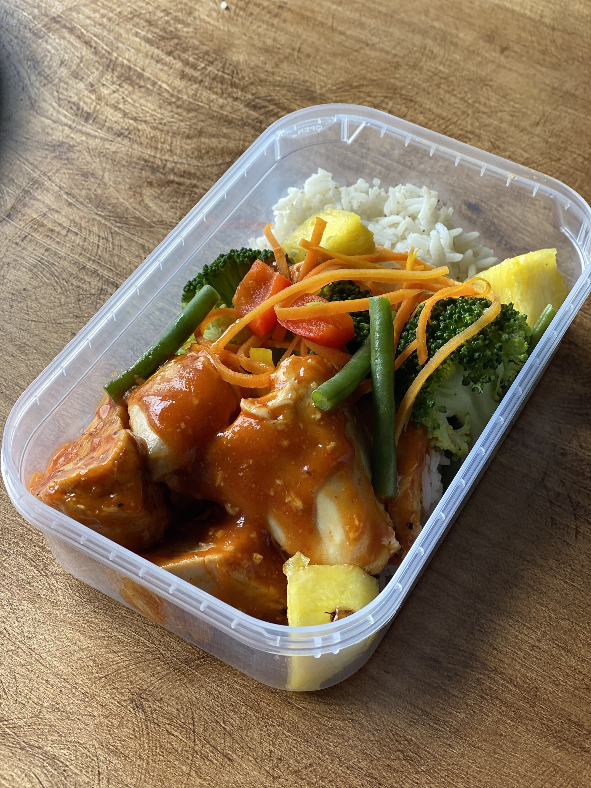 Thick cut chicken breast fillets, marinated in a sweet & sour sauce, with pineapple & mixed veg on a wild rice base
