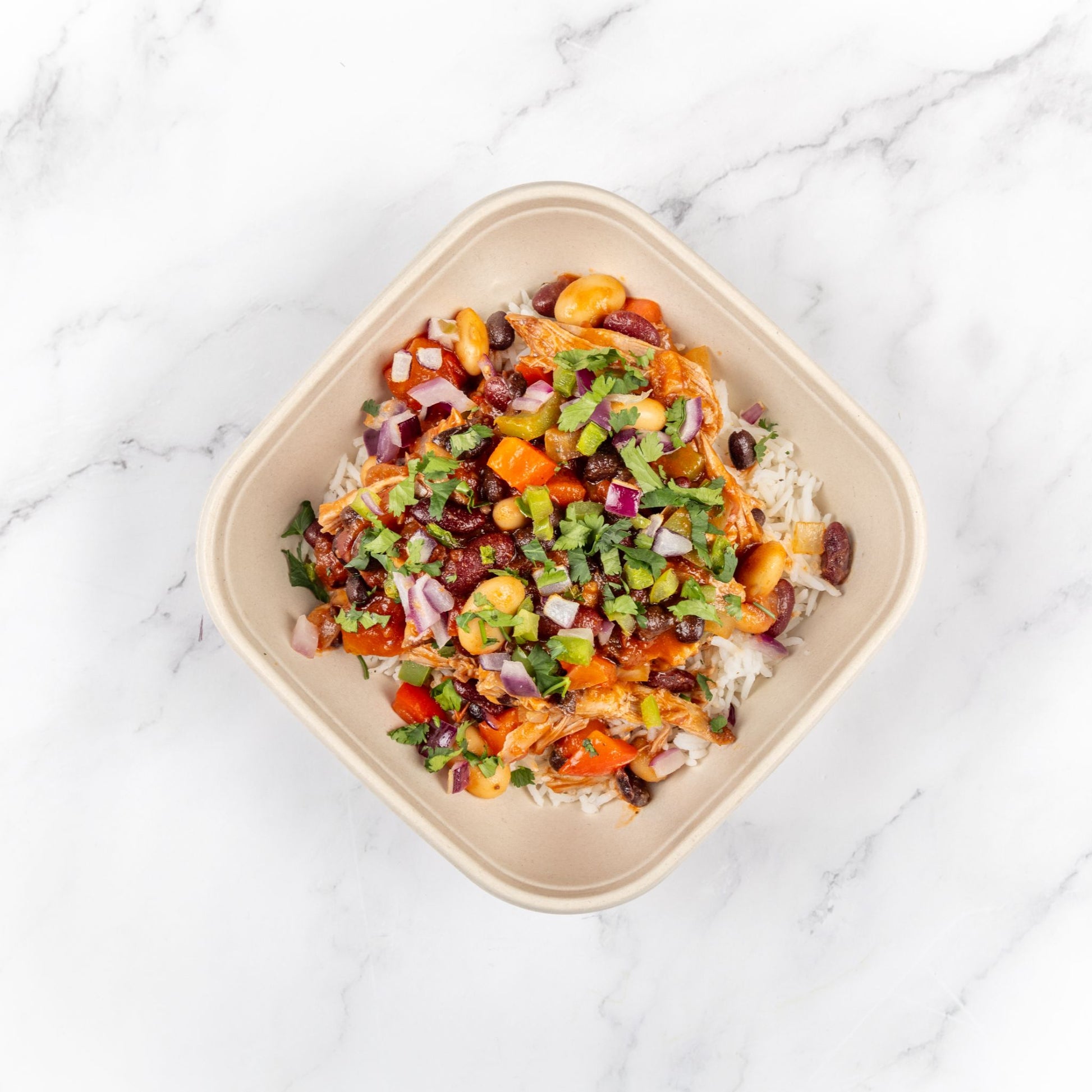 White Basmati Rice, Pork, Mixed Bean Chilli (Kidney Beans, Butter Beans, Black Beans, Cannellini Beans, Chopped Tomatoes, Sun Ripened Tomatoes, Tomato Puree, Onion, Sunflower Oil, Sugar, Salt, Herbs and Spices [Black Pepper, Oregano, Basil], Garlic, Acidity Regulator [Citric Acid], Firming Agent [Calcium Chloride], Cajun Spice, Smoked Paprika, Garlic, Red Peppers, Green Peppers, White Onion, Chicken Stock), Salt, Black Pepper, Red Onion, Green Chillies