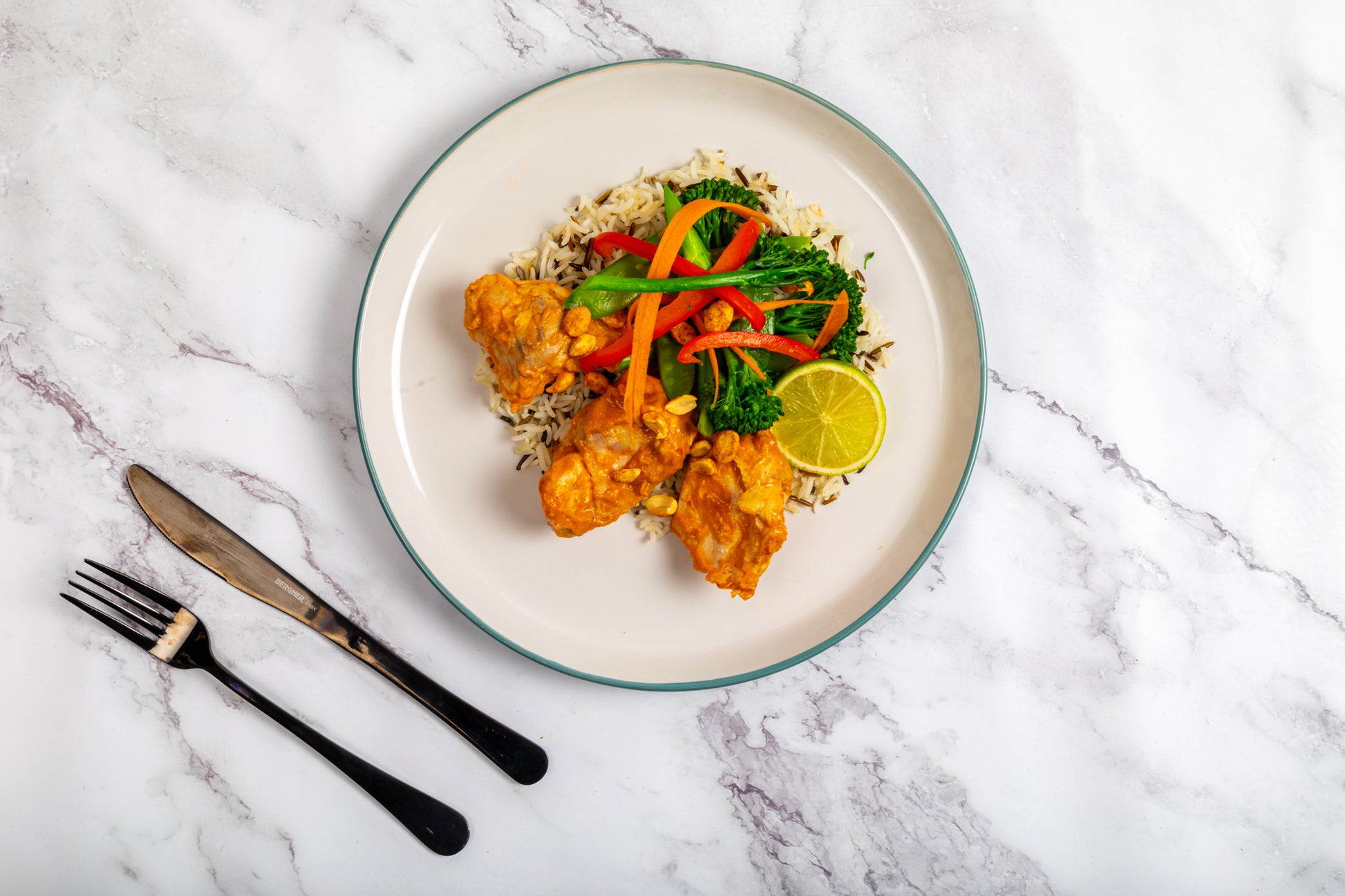Thai Chicken Satay with Lime Rice and Seasonal Green, nutritionally substantial and satisfying. Tender marinated chicken, blistered and bronzed, served over zesty lime-inflected rice and a crisp bed of seasonal greens. Rich, peanut kissed sauce adds depth without heaviness, delivering a balanced profile of lean protein, wholesome carbs, and vibrant veg. A flavourful, nutrition forward option that’s perfect for your meal prep, fitness focus clients, nourishing weeknight dinner.